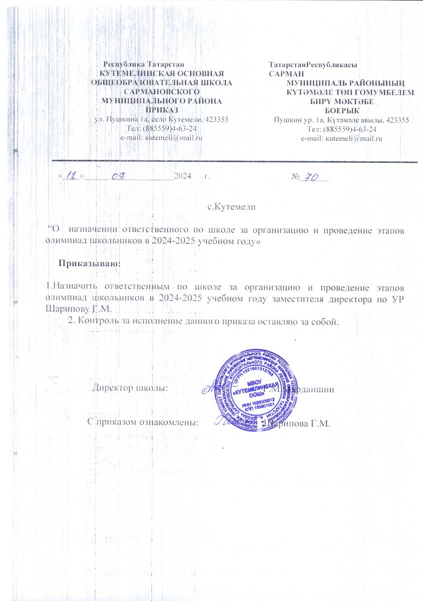 Приказ школы "О проведении школьного этапа олимпиад" за 2024-2025 учебный год