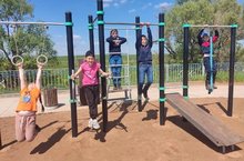 Сегодня в пришкольном лагере " Солнышко" учащиеся общались с воспитанниками дошкольной группы, занимались на спортивных снарядах