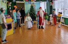 показали гостям новогоднюю сказку «Теремок». Им пришлось перевоплотиться в сказочных персонажей и у них это получилось. С самого начала представления сказочные герои увлекли детей в увлекательный мир сказки. С появлением Деда Мороза начался настоящий праздник с песнями и танцами, хороводами вокруг ёлки. После представления дети читали стихи Деду Морозу, фотографировались и получили новогодние подарки. -