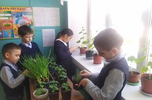 Учащиеся 1 и 3 классов посадили и вырастили на подоконнике зеленый лук, салат, укроп, зеленый горох, томаты и огурцы. 1 һәм 3 сыйныф укучылары тәрәзә төбендә яшел суган, салат, укроп, яшел борчак, помидор һәм кыяр үстерәләр.