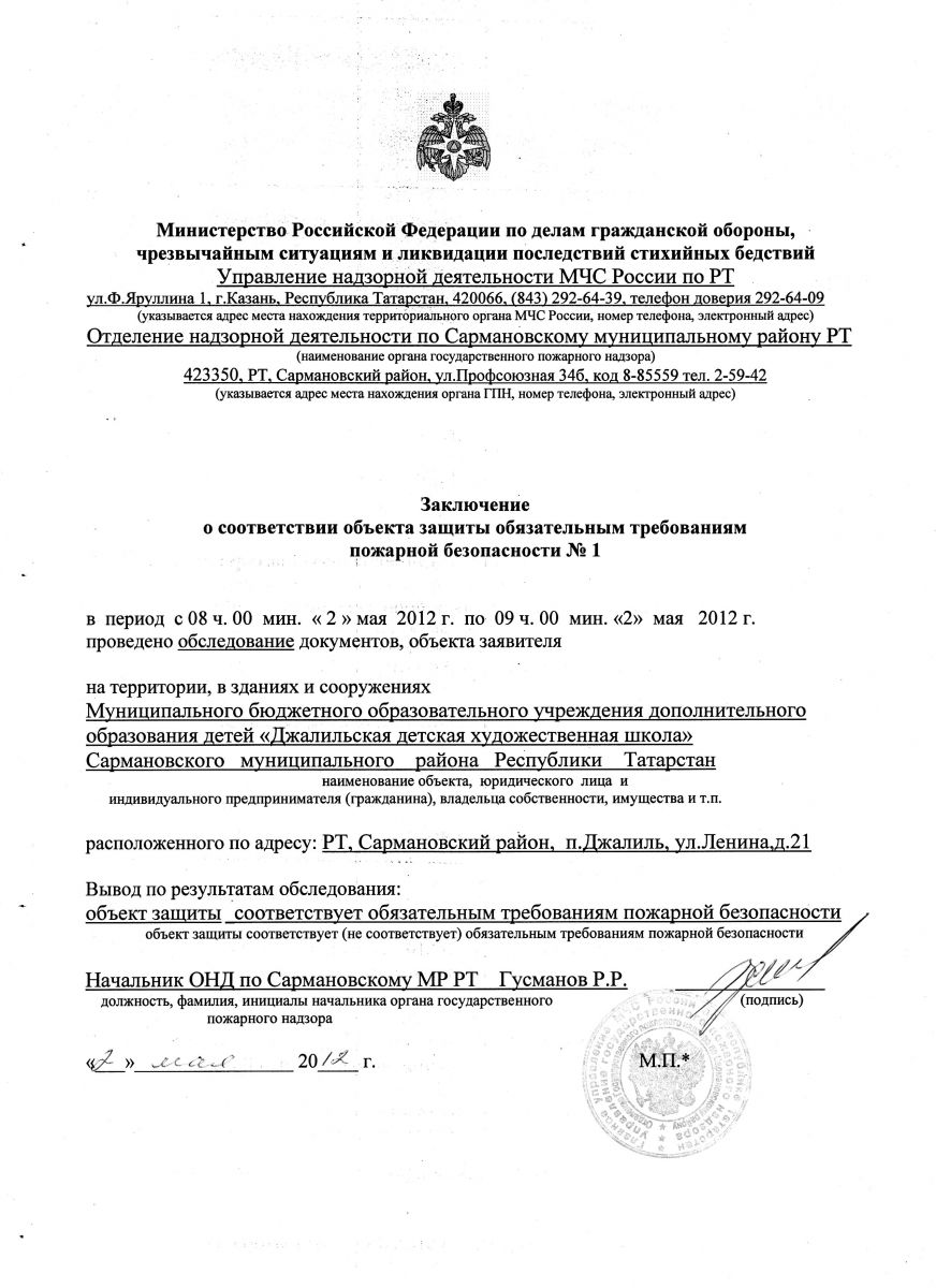Заключение о соответствии обязательным требованиям пожарной безопасности.
