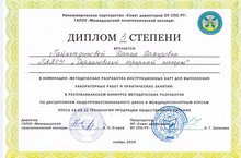 Преподаватель по кулинарии Сармановского аграрного колледжа Гайнетдинова Дания Дамировна заняла III призовое место, и награждена Дипломом III степени в номинации «Методическая разработка инструкционных карт для выполнения лабораторных работ и практических занятий» Республиканского конкурса методических разработок по дисциплинам общепрофессионального цикла и междисциплинарным курсам ППССЗ 19.02.10 «Технология продукции общественного питания». Конкурс состоялся 29 ноября 2019 года в ГАПОУ «Мамадышский политехнический колледж».