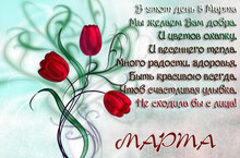 Сегодня особенный день в календаре – 8 марта, Международный женский день, праздник весны, красоты и любви. Так хочется пожелать для всех вас, женщины и девушки, что-то особенного, доброго: здоровья вам, любви и теплоты от родных сердец, добрых подарков от судьбы, женского счастья и неувядаемой красоты, уверенности в себе, уважения от коллег. Пусть этот солнечный день принесет вам только радость и хорошее настроение, и пусть добрая подруга-удача никогда не покинет вас!