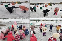 Три шара, ведро, морковкаИ для глаз два уголька;Палки-руки вставим ловко –Лепим мы снеговика.