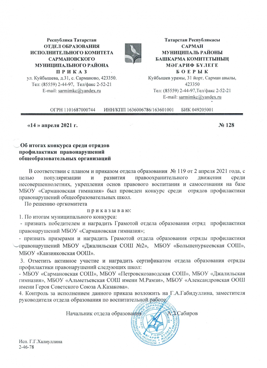 Приказ об итогах муниципального этапа конкурсов антикоррупционной направленности