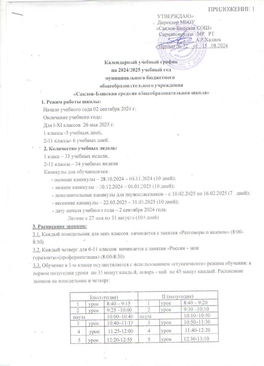 Режим работы: КАЛЕНДАРНЫЙ УЧЕБНЫЙ ГРАФИК.Начало занятий в 8.00. Уроки по 45 минут. В первых классах 5-ти дневная учебная неделя. Со 2-11 классы режим 6-ти дневной недели. Учебные занятия проводятся в одну смену.