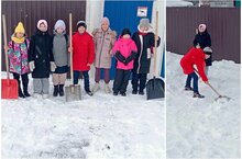 Учащиеся Сарайлинской ООШ помогают одиноким пожилым людям очистить снег. -