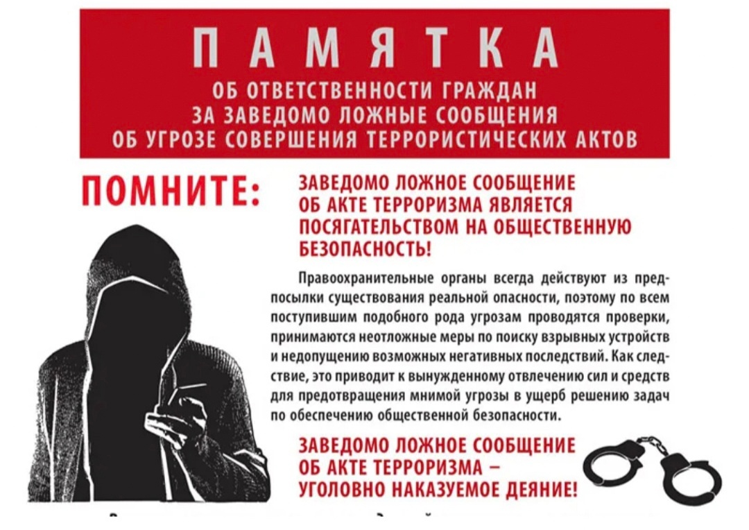 Памятки о юридической ответственности за заведомо ложное сообщение об акте терроризма, а также несанкционированное использование беспилотных воздушных судов