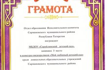 Наш детский сад награжден грамотой ОО занявшее 3 место в конкурсе видеороликов "Мой любимый детский сад" среди дошкольных образовательных учреждений./ "Мой любимый детский сад" видеоролик конкурсында катнашып безнең балалар бакчасы 3 нче урынны алды.