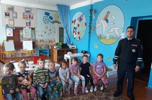 В нашем детском саду состоялась встреча с инспектором отдела ГИБДД Хуснутдиновым А.А.. Инспектор по пропаганде безопасности дорожного движения рассказал детям о том, как правильно вести себя на проезжей части и объяснил правила езды на велосипеде.\Безнең балалар бакчасында ЮХИДИ бүлеге инспекторы Хөснетдинов А. А. белән очрашу булды.. Юл хәрәкәте иминлеген пропагандалау буенча инспектор балаларга юл йөрү өлешендә үзеңне ничек дөрес тотарга кирәклеге турында сөйләде һәм велосипедта йөрү кагыйдәләрен аңлатты.
