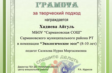 Активное участие приняли и ученики нашей школы. Ученица 4 класса Хадиева Айгуль была награждена Грамотой «За творческий подход» в номинации «Экологическое эссе» ( 8- 10 лет).