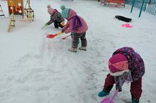 Трудовое воспитание.Учить детей правильно пользоваться лопатками и очищать территорию от снега.