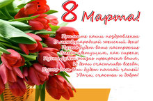 Поздравляю Вас с днем 8 Марта! Желаю Вам солнечных улыбок, радости в душе, любви в сердце, отличного настроения, крепкой и верной дружбы, а также большой, просто огромной, теплой и очень земной любви! Любите сами и будьте нежно любимы вашими мужчинами и детьми! Пусть вас ценят на работе, любят и ждут дома!!!С праздником ВАС!!!!!С уважением к вам, заведующая Л.Г.Афзалетдинова -