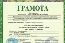 Гибадуллин Рузиль стал победителем в номинации "Выразительное исполнение " VII - Республиканской научно- практической конференции "Туган җир сулышы" по теме "Люблю свой край родной".