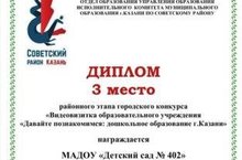 - формирование позитивного общественного представления о возможностях образовательной системы дошкольного образования г.Казани.Видеовизитка нашего детского сада заняла 3 место на районном этапе. Ура!