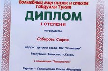 Воспитанница старшей группы Сабирова Сафия приняла участие во Всероссийском творческом конкурсе "Волшебный мир сказок и стихов Габдуллы Тукая".