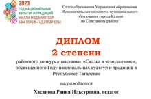 Педагог, Хасанова Рания Ильсуровна принимала участие в районном конкурс - выставке "Сказка в чемоданчике" посвященного Году национальных культур и традиций в Республике Татарстан и была награждена Дипломом 2 степени.