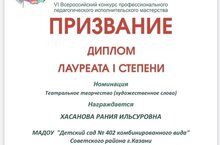 Воспитатель детского сада Хасанова Рания Ильсуровна приняла участие в VI Всероссийском конкурсе профессионального педагогического мастерства ПРИЗВАНИЕ. Награждена Дипломом Лауреата I степени. Поздравляем и желаем дальнейших творческих успехов!