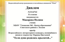 Поздравляем дипломанта Всероссийского литературного конкурса "Если душа родилась крылатой", посвященного жизни и творчеству Марины Цветаевой, ученицу 9Б класса Макарову Полину (руководитель Геловани Гюзель Фандусовна), занявшую 2 место в номинации "Мир поэта" (конкурс чтецов). Желаем дальнейших творческих успехов!