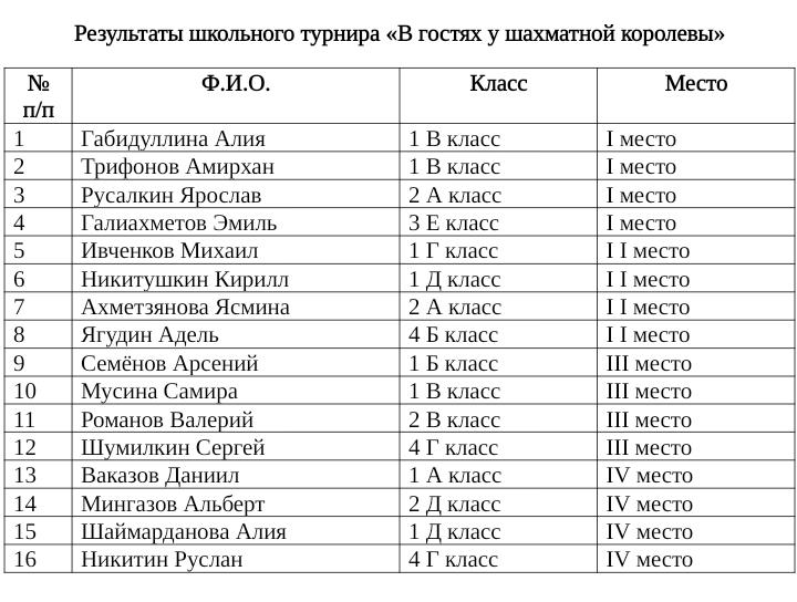 20 ноября в гимназии 8 прошёл шахматный турнир под названием «В гостях у Шахматной королевы» среди учеников 1-4 классов, в котором приняли участие 62 ученика. В праздничной атмосфере дети встретили Королеву (в роли которой была учитель нач.классов Николаева Н.Н.), услышали напутствие, в игровой форме ответили на блиц-вопросы о шахматных фигурах. Началась игра. Судья Латфуллин Айдар Рамисович (кандидат в мастера спорта) и болельщики внимательно следили за ходом сражений. Играющие должны были рассчитывать возникающие варианты, наметить план игры, уметь противостоять планам противникам и бороться до победного. Ребята проявили сосредоточенность, устойчивость внимания.