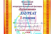 Участница театральной студии «Колибри» Сазанова Ульяна под руководством Фахрутдиновой Лейсан Даниловны стала лауреатом 1 степени Всероссийского отраслевого литературно-музыкального фестиваля «Вдохновение», посвящённого 74 летней годовщине Победы в ВОВ. Пронзительное прочтение Сазоновой Ульяной стихотворения М.Джалиля «Чулочки», нашло живой отклик в сердцах зрителей и компетентного жюри. Поздравляем с победой!