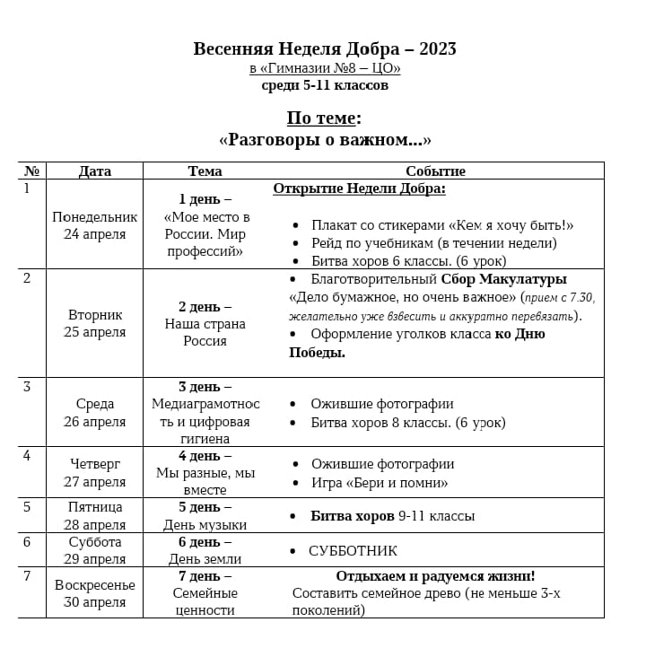 Дорогие учащиеся гимназии, приглашаем вас принять активное участие в весенней неделе добра - 2023 по теме: "Разговоры о важном..." Ознакомиться с программой можете пройдя по ссылке ПРОГРАММА