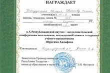 В X Республиканской научно-исследовательской конференции школьников, посвященной памяти татарского ученого-просветителя Ибрагима Хальфина, наши ученики заняли 1-е места: