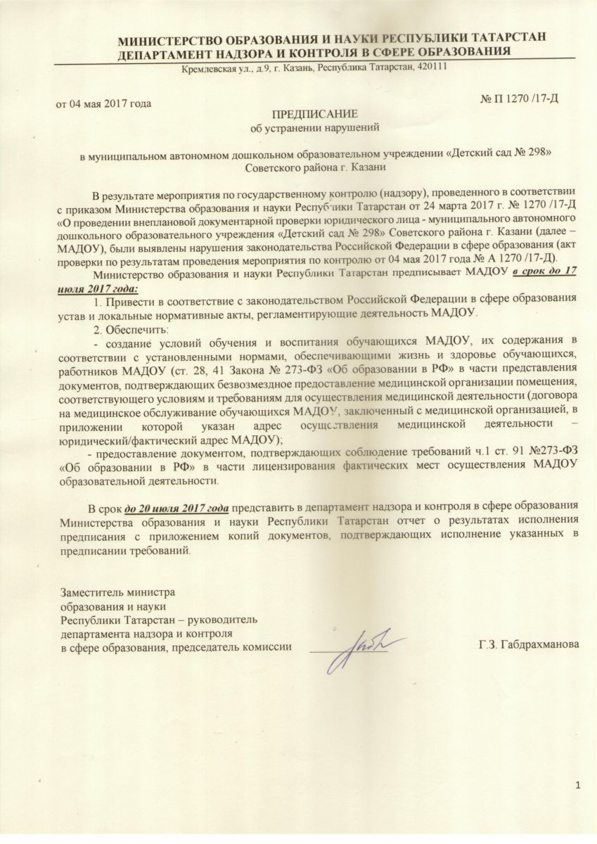 Предписание Министерства образования и науки РТ Департамента надзора и контроля в сфере образования /upload/storage/org3058/files/предписания.jpeg, о выполнении предписания /upload/storage/org3058/files/img20180126_11493703.jpg