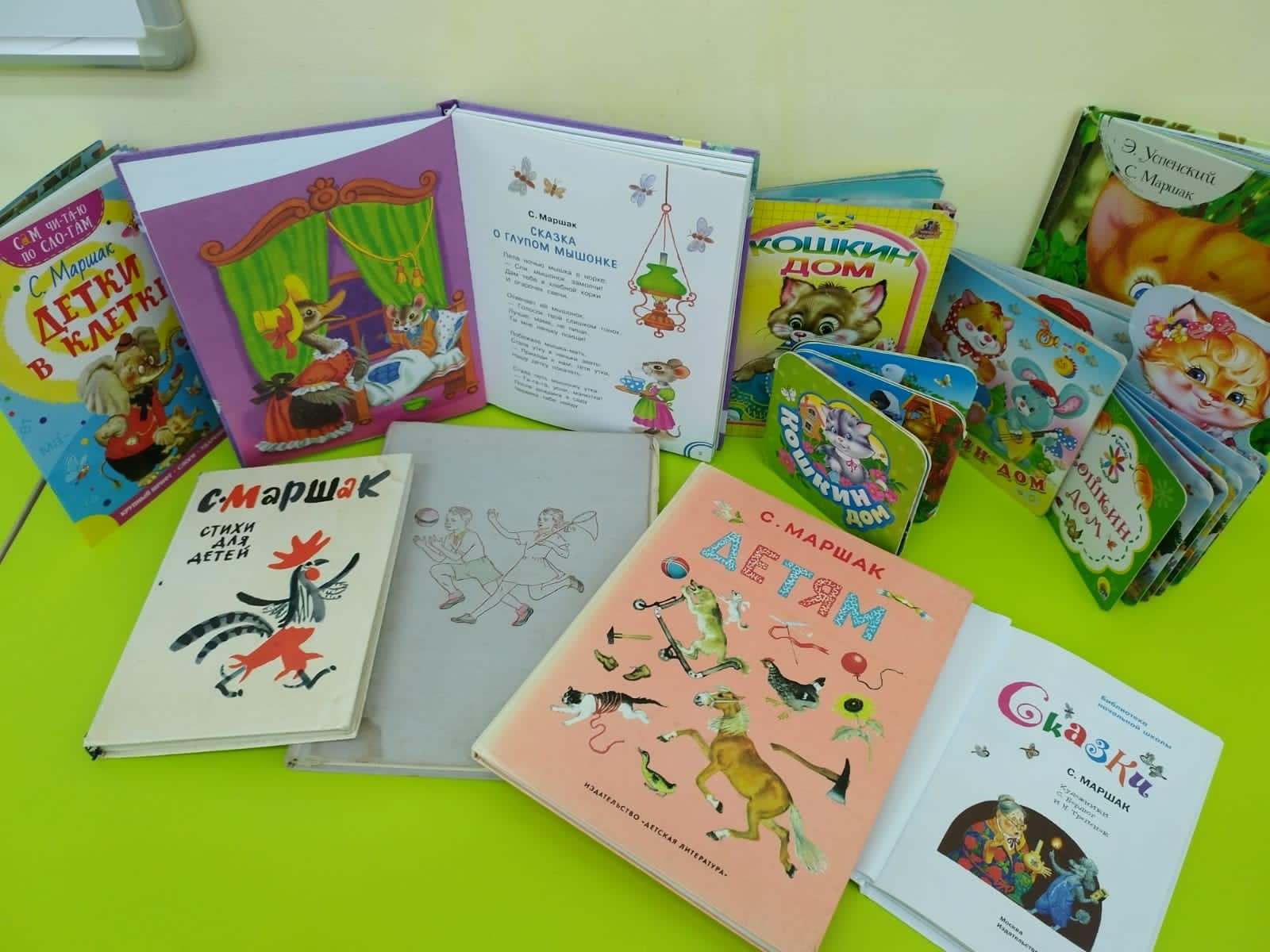 В книжных уголках средних, старших, подготовительных групп воспитатели с детьми организовали выставки книг "Наш Маршак" и рисунков "Веселая палитра" по произведениям С.Я. Маршак. Воспитатели младшей группы провели консультацию для родителей, где рассказали о творчестве знаменитого литератора и дали рекомендации для домашнего чтения с детьми.