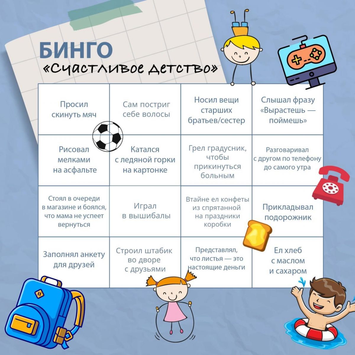 Давайте вспомним самые яркие моменты нашего детства и поделимся ими! Пишите в комментариях, что из перечисленного в нашем бинго вам близко и какие веселые приключения помнятся до сих пор