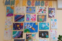 На 1 и 2 этажах детского сада оформлены выставки рисунков "Мир космоса", посвященные Дню космонавтики. Подготовлено много ярких рисунков, отображающих тайны космического пространства глазами юных художников.