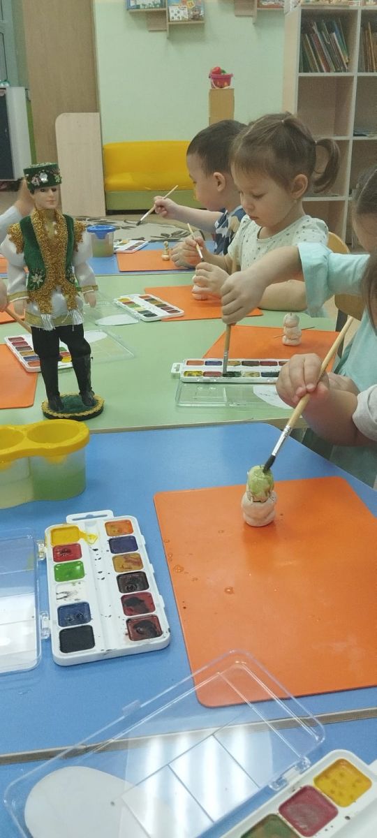 Сначала мы рассказали детям о татарской культуре и традициях, показали картинки с изображениями национальных костюмов. Дети с интересом слушали и задавали вопросы. Затем мы приступили к лепке. Каждый ребенок получил кусочек белой глины, из которой они начали формировать тело снеговика. Мы помогали им создавать элементы татарского костюма: яркие жилеты, пояса и головные уборы - тюбетейки.