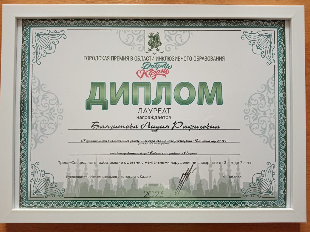 Педагог структурного подразделения МАДОУ109 Баязитова Лидия Рафизовна (учитель-дефектолог) стала Лауреатом конкурса. Желаем дальнейших успехов!