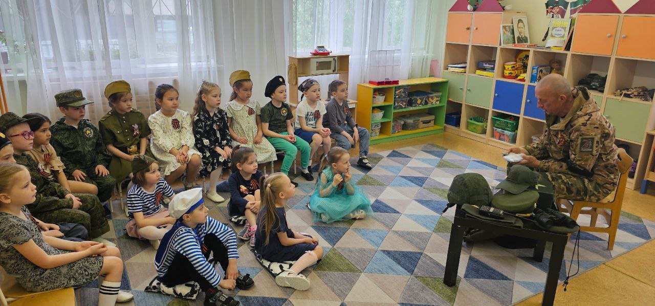 В честь праздника Победы и в честь всех защитников Отечества в гостях у детей подготовительной к школе группы был настоящий защитник Отечества - ветеран боевых действий, участник СВО Гарифуллин Рустам Мухаматханович, который еще является дедушкой нашей воспитанницы Рианны.Наш детский сад регулярно проводит воспитательную работу по формированию патриотических чувст и любви к Родине, педагоги и гости ведут беседу про ценность семьи, про защитников Отечества.