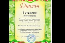 Дипломом I степени награждена Кузьмина Анастасия Владимировна, ученица 9 класса за участие в I Республиканском лингвистическом форуме "Объединяя языки и культуры" , в номинации "Властелин звуков"