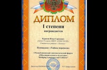 Дипломом победителя I Республиканского лингвистического форума, площадка: " Тайны перевода", награжден Курасов Илья Сергеевич, ученик 9 класса