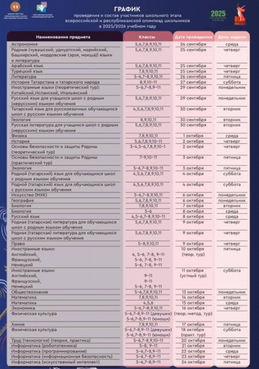 Школьный этап Всероссийской и Республиканской олимпиады школьников 2025-26 учебного года будет проходить с 24 сентября по 24 октября. Всем желаем успехов и новых побед!!!!!