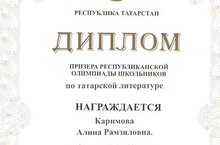 Поздравляем ученицу 11А класса Каримову Алину призера заключительного этапа Республиканской олимпиады школьников по татарской литературе! Молодец!Подготовила призера учитель родного языка Каримова Ф.Ю.