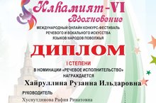 Поздравляем ученицу 5Г класса Хайруллину Рузанну Ильдаровну с победой в международном онлайн конкурс-фестивале «Илһамият-VI Вдохновение» в номинации «Речевое исполнительство». Молодец, Рузанна!