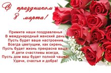 Поздравляем наших прекрасных дам с днем 8 Марта! Пожелаем им волшебных дней, изумительного настроения и обаятельной женственности! Пусть в ваших семьях царит частичка добра, благополучия, достатка и уюта. Сияния души вам и аромата свежих роз.