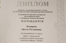 Аглетдинова Ландыш Филүс кызын һәм аның укучысы Комарова Айгөлне туган (татар) тел әдәбияты буенча республика олимпиадасының йомгаклау этабында лаеклы җиңүе белән котлыйбыз! Уңышлар һәм тагын да зуррак җиңүләр телибез!