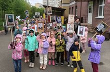 Сегодня в нашем детском саду прошла акция «Бессмертный полк». Воспитанники детского сада, совместно с родителями, подготовили портреты своих родных – участников ВОВ, изготовили транспаранты.