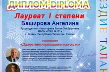 Поздравляем ученицу 7 Б класса нашей школы Баширову Ангелину, победившую в двух номинациях Международного телевизионного конкурса "Созвездие талантов-2019", который проходил в Чебоксарах с 4 по 7 января. Она стала лауреатом 1 степени в номинации "Декоративно-прикладное искусство", руководитель учитель технологии Мустафина Лилия Эльбрусовна и лауреат 1 степени в номинации "Художественное слово", руководитель учитель русского языка и литературы Ахметшина Альфия Ильясовна. Ещё раз поздравляем Ангелину и её руководителей. Дальнейших вам творческих успехов!!!