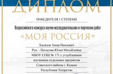 Поздравляем ученика 5 Б класса Хасянова Амира и его руководителя-учителя географии Пигасову Юлию МИхайловну с победой,1 место, во Всероссийском конкурсе научно-иследовательских и творческих работ "Моя Россия".