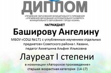 Поздравляем Баширову Ангелину, ученицу 10А класса, за победу в городском конкурсе театральных искусств "СТИХиЯ" в номинации "Литературно музыкальная композиция" и победа во второй номинации "Авторское произведение". Благодарим руководителя за подготовку учителя русского языка и литературы Ахметшину А.И. Желаем им дальнейших успехов!