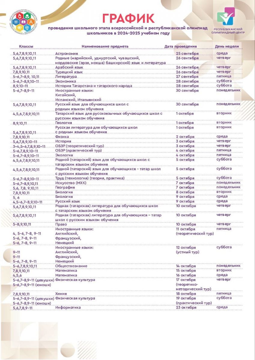 График проведения школьного этапа всероссийской и республиканской олимпиад школьников в 2024-2025 учебном году