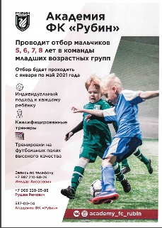 Академия ФК "Рубин" проводит отбор мальчиков 5,6,7,8 лет в команды младшей группы.Подробнее можно узнать пройдя по ссылке. -