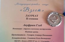 Учащийся 2 класса Ануфриев Глеб (преподаватель А.Н.Гумаров, концертмейстер О.В.Гиматова) стал Лауреатом II степени Международного фестиваля-конкурса «Взлет», учредителем которого является Региональный благотворительный общественный фонд развития исполнительского искусства РТ «SFORZANDO»