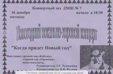 14 декабря 2016 г. в ДМШ №7 на площадке Средней школы № 15 в канун Нового года прошел концерт учащихся «Новый год настает». На концерте участвовали учащиеся всех классов. Были исполнены произведения на различных инструментах. Особо хочется отметить хор, при небольшом составе были исполнены 2-х и 3-хголосные песни. Концерт прошел при полном зале зрителей. Родители остались очень довольными, а также высказали слова благодарности преподавателям.