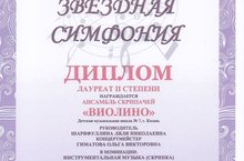 Учащиеся ДМШ №7 им.А.С.Ключарева: старший ансамбль скрипачей «Violino» (руководитель Шарифуллина Л.Н., концертмейстер Гиматова О.В.) – лауреат II степени, учащиеся отдела духовых инструментов Оглоблина Валерия и Ионова Арина (преподаватель Склярова Г.А., концертмейстер Крюкова О.С.) - дипломанты II и III степени I Международного конкурса «Звездная симфония».